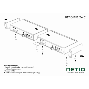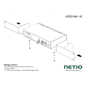 Metal brackets to install one NETIO 4C or NETIO Power PDU 4C device into a 1U space in a 19” rack frame