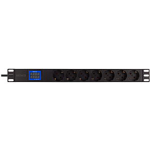 19" 1U 7 Schuko pesa ja Schuko pistikuga toitepaneel, 3.5kW, numbriline volt- ja ampermeeter, 2m, must