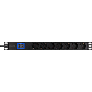 19" 1U 7 Schuko pesa ja C14 pistikuga toitepaneel, 2.5kW, numbriline volt- ja ampermeeter, 2m, must